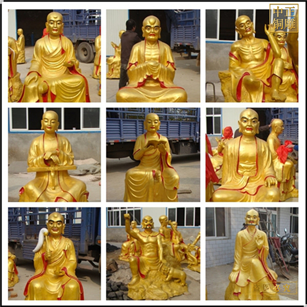 而這些羅漢的形象都是由后來(lái)的藝術(shù)家憑借自己的想象創(chuàng)作出來(lái)的,原來(lái)這些羅漢像并沒(méi)有固定的形象。古代許多著名畫(huà)家都畫(huà)過(guò)十六羅漢圖,而現(xiàn)在的羅漢像大多也是參考那些畫(huà)像而創(chuàng)作出來(lái)的。羅漢除了有銅雕十八羅漢和十六羅漢之分,還有更大陣勢(shì)的銅雕五百羅漢呢?