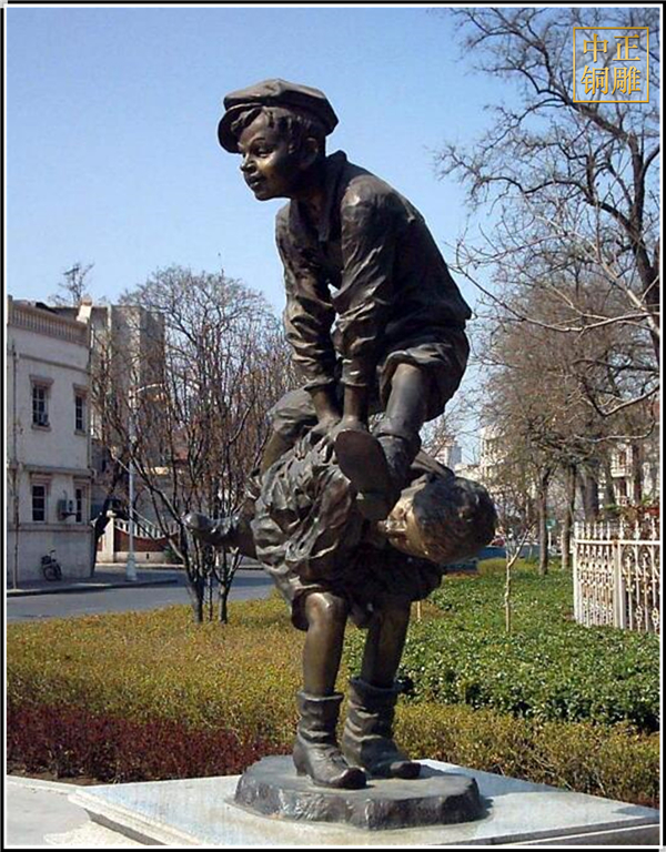 中正銅雕-兩個小男孩跳背人物銅雕塑、兩個小男孩跳背人物銅雕塑價格、兩個小男孩跳背人物銅雕塑廠家,本公司打造了一支強有力的管理隊伍和創新團隊,在國內同行中成為佼佼者。加強與國內知名專家的合作,提升公司的實力,打造公司文化品牌,提升公司的品牌價值及創造力,為社會創作更多有品位的雕塑作品。無論從黃銅鑄造,錫青銅鑄造都能熟練掌握其材料比例和配方。能使鑄件抗氧化,防腐蝕性,防酸,防堿及使鑄件外力沖擊而不折,能熟練鑄造銅鐘,銅鼎,編鐘,銅鼓等高難度的產品。