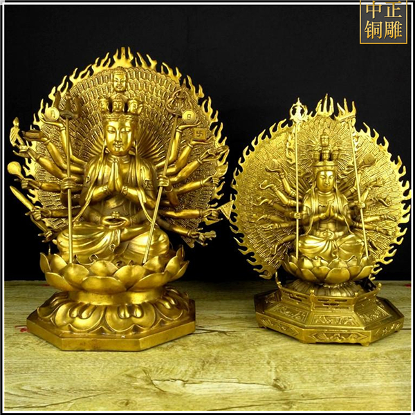 觀音的化身有很多,而千手觀音就是其中之一,而且還受到人們的虔誠供奉,但不知道大家是否了解千手觀音的來歷呢,“千”為無量及圓滿之義,以“千手”表示大慈悲的無量廣大,以“千眼”代表智慧的圓滿無礙。千手千眼觀世音能利益安樂一切眾生,隨眾生之機。中正銅雕-純銅千手觀音像、純銅千手觀音像價格、純銅千手觀音像廠家我司是一家資質齊全、設備完整、實力雄厚的私營企業,集科研、開發設計、普通鑄造、一次性整體澆鑄、精密鑄造于一體。主要鑄造大型現代人物銅雕,抽象人物銅雕,抽象人物銅雕,歷史人物銅雕,動物銅雕,園林景觀銅雕等。