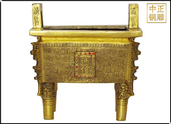 方鼎作為方形槽或長方形槽的四足雙耳容器,也沒有形成一定的規(guī)模。因此圓鼎是歷史上流行時間最長的青銅鼎式。圓鼎的基本形態(tài)是腹腔非常圓而深,耳小直立于口緣上,三足為錐形。在春秋戰(zhàn)國時期,圓形的青銅鼎已經(jīng)成為了最主流的禮器,更是用來“明尊卑,分上下”的禮器。中正銅雕-純銅誠信鼎、純銅誠信鼎價格、純銅誠信鼎廠家,追求卓越、開拓創(chuàng)新、“重合同”、“守信譽(yù)”、讓客戶滿意的經(jīng)營理念。唐縣中正銅雕工藝品廠竭誠為國內(nèi)外客戶提供優(yōu)秀的服務(wù),愿與新老客戶攜手共創(chuàng)美好未來。